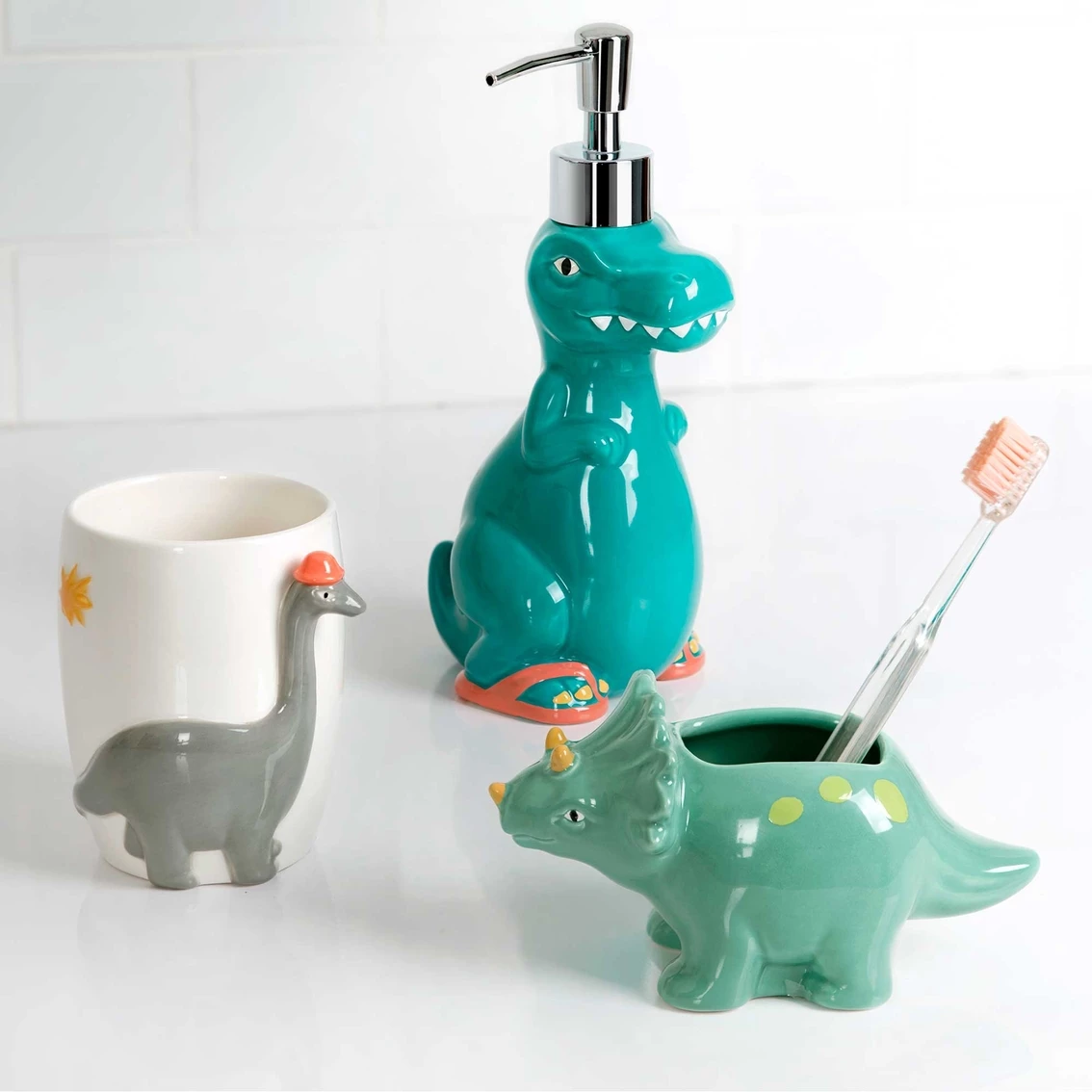 Transform your child’s bathroom into a prehistoric playground with the Dinosaur Tumbler by Allure. This whimsical accessory is made of ceramic, creatively embossed to add dimension and painted in vibrant glossy bright colors. This versatile piece can be used for drinking and rinsing or as a small container to store and organize many of your bathroom essentials. This delightful dino-mite buddy is sure to bring fun and adventure to your little dinosaur enthusiast’s bathroom. For best care hand wash, spot or wipe clean. Use alone or coordinate with the Dinosaur Shower Curtain and other matching Bath Accessories.
