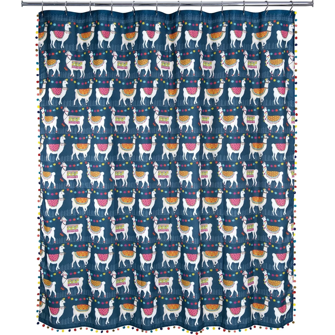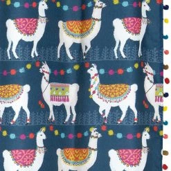 Add a touch of whimsical charm to your bathroom with the Llamas Shower Curtain by Allure Home Creation. This fun and novel Shower Curtain design, set against a rich navy background, features adorable llamas adorned in multi colored decorative blankets and is bordered with brightly colored fluffy pom poms. Reinforced header with 12 buttonholes. Perfect for all ages. Printed on 100% easy care polyester crepe. A coordinating Towel Set and Rug are also available, sold separately. Machine wash and tumble dry on low heat. Size: 70 x 72 inches. Model: LAMSC00.