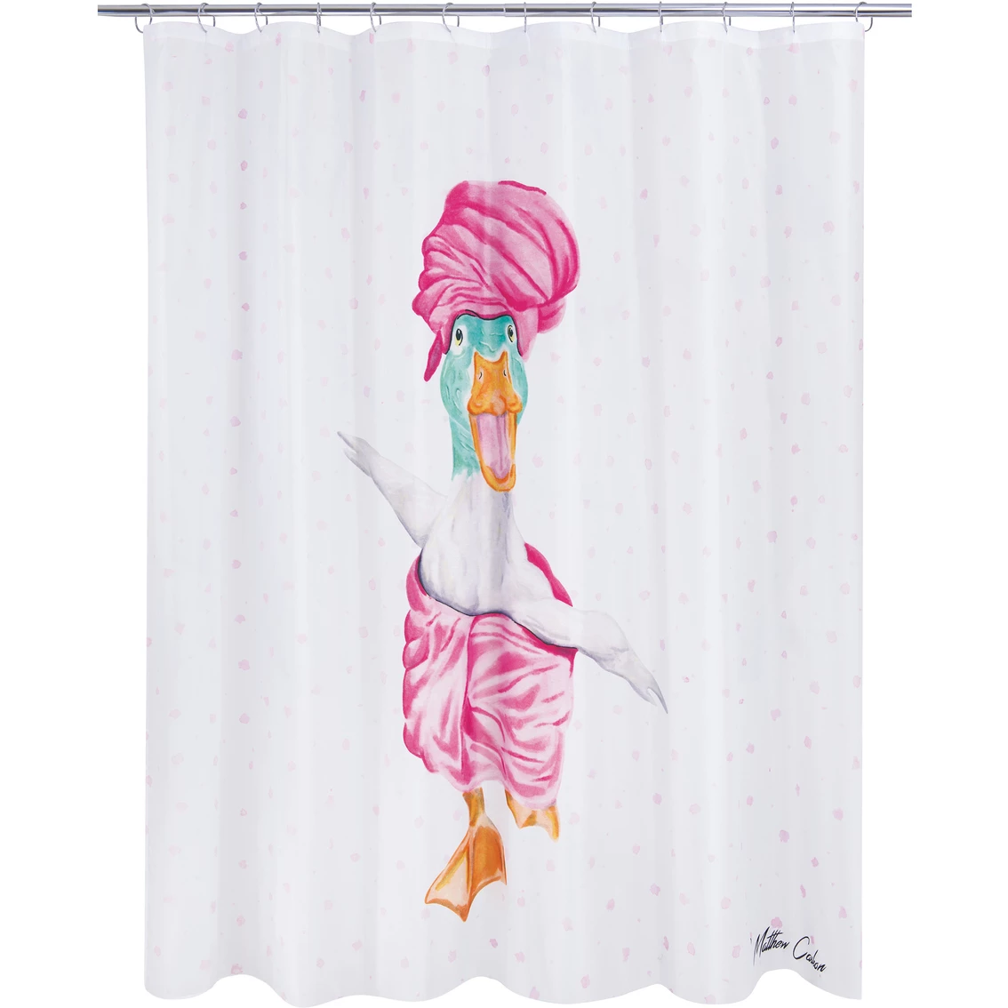 Bring tons of fun and whimsy to your bathroom with the Mud Mask Duck (Matthew Carlson) Shower Curtain by Allure Home Creation. The quirky charm of this delightful duckie wearing a facial mud mask while strutting around in a body and hair towel is sure to bring a big smile to your face. This oversized graphic design is printed on 100% easy care plain weave polyester taffeta in multi colors against a subtle dotted background on white. Not only will this shower curtain add a novel touch to your bathroom, it will also help prevent water from splashing outside of your tub or shower stall. The reinforced button-hole top on shower curtain works with standard shower hooks and curtain rods. Use of a liner is recommended. Size: 70 x 72 inches. Easy care-machine wash and tumble dry. Model: MDKSC00.