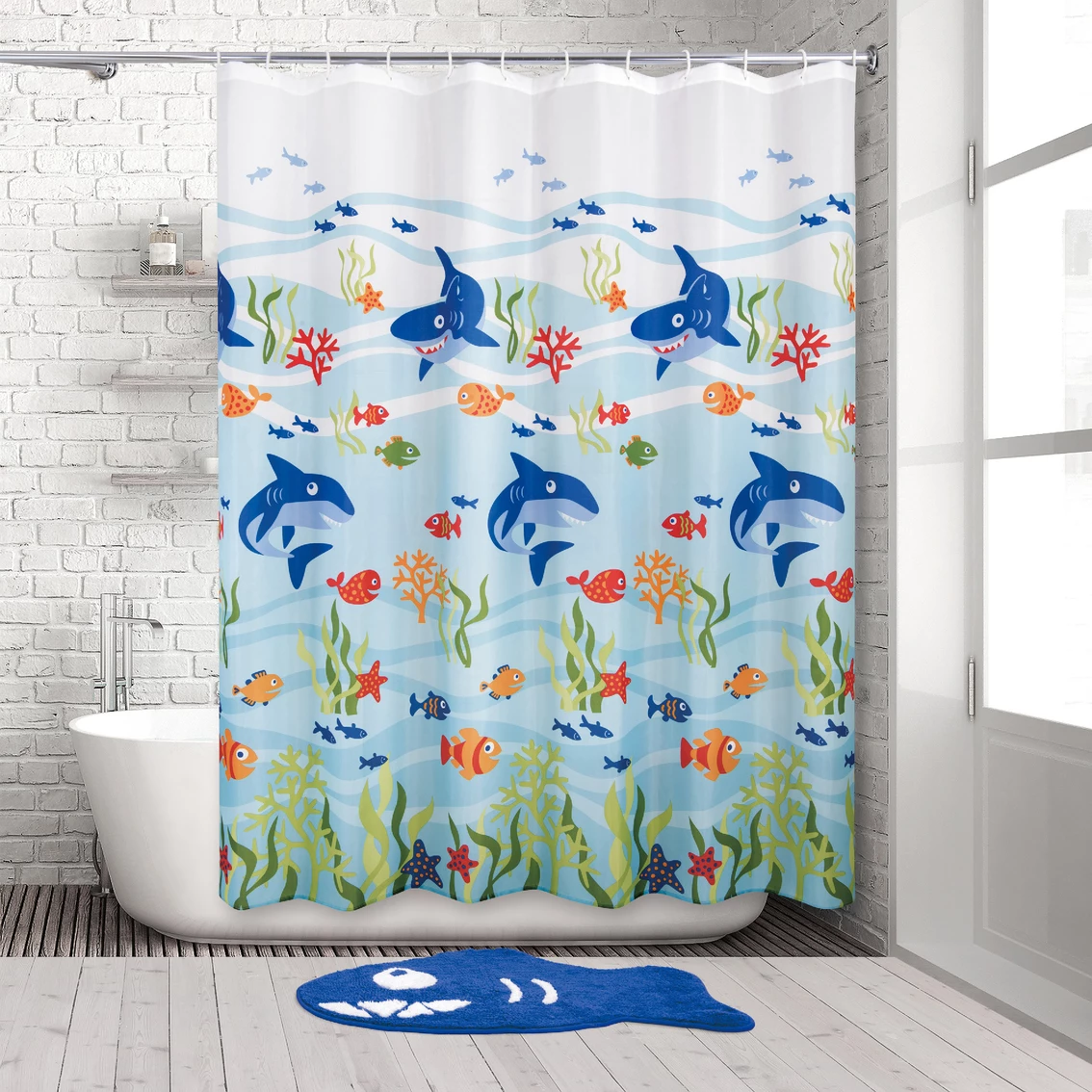 Make every day bath time a fun underwater adventure for your kids with the Shark Bath Rug by Allure Home Creation. This tufted bath rug, made of 100% cotton with a skid resistant latex backing, features a whimsical shaped bright blue shark. It measures 21 in. x 34 in. and will give your little one a comfy, soft spot to stand while keeping your floor clean and dry. This sea-inspired character design is sure to entertain your little one and bring a big smile to their face. Machine wash cold and tumble dry on low heat. Use alone or coordinate with the Shark Shower Curtain and other matching Bath Accessories.