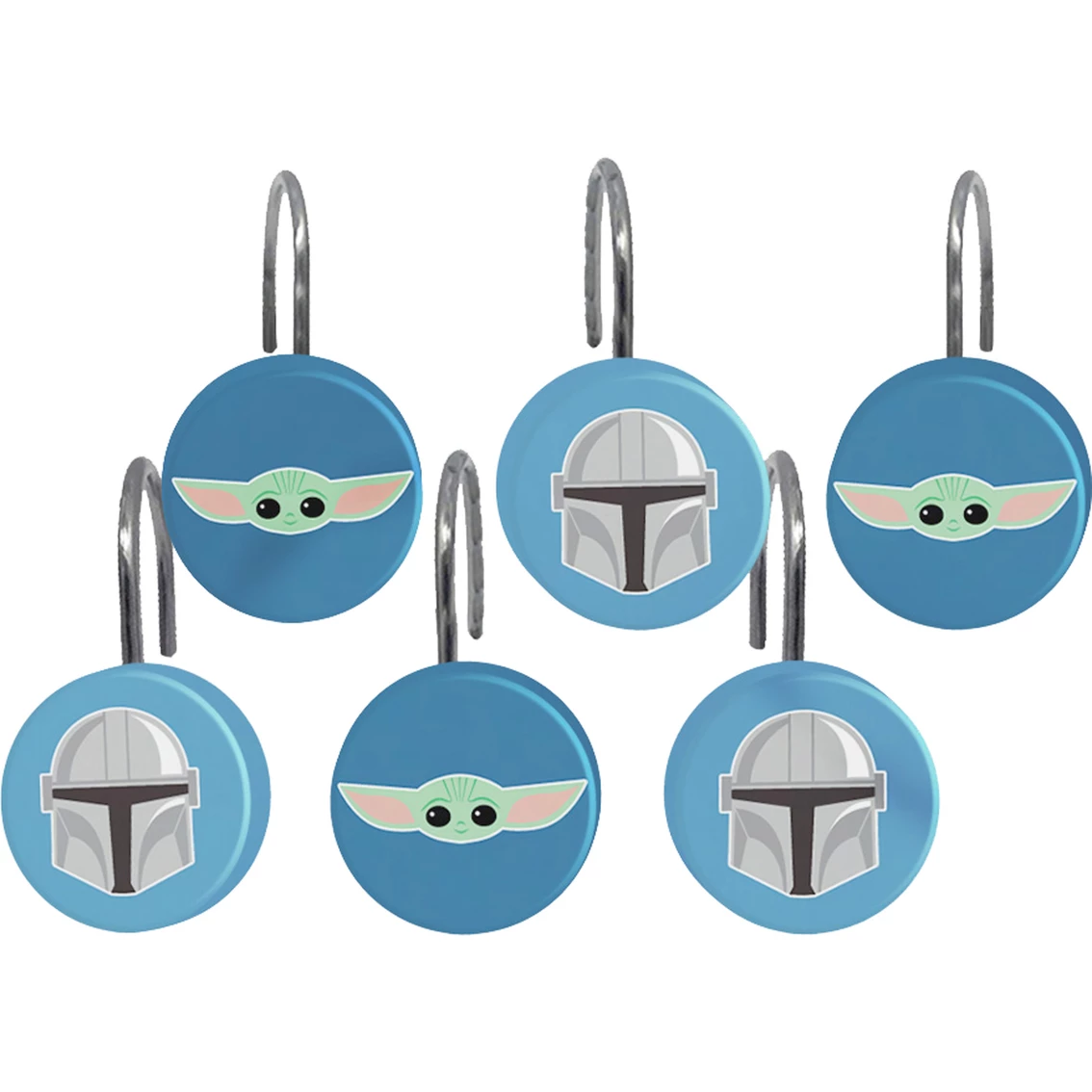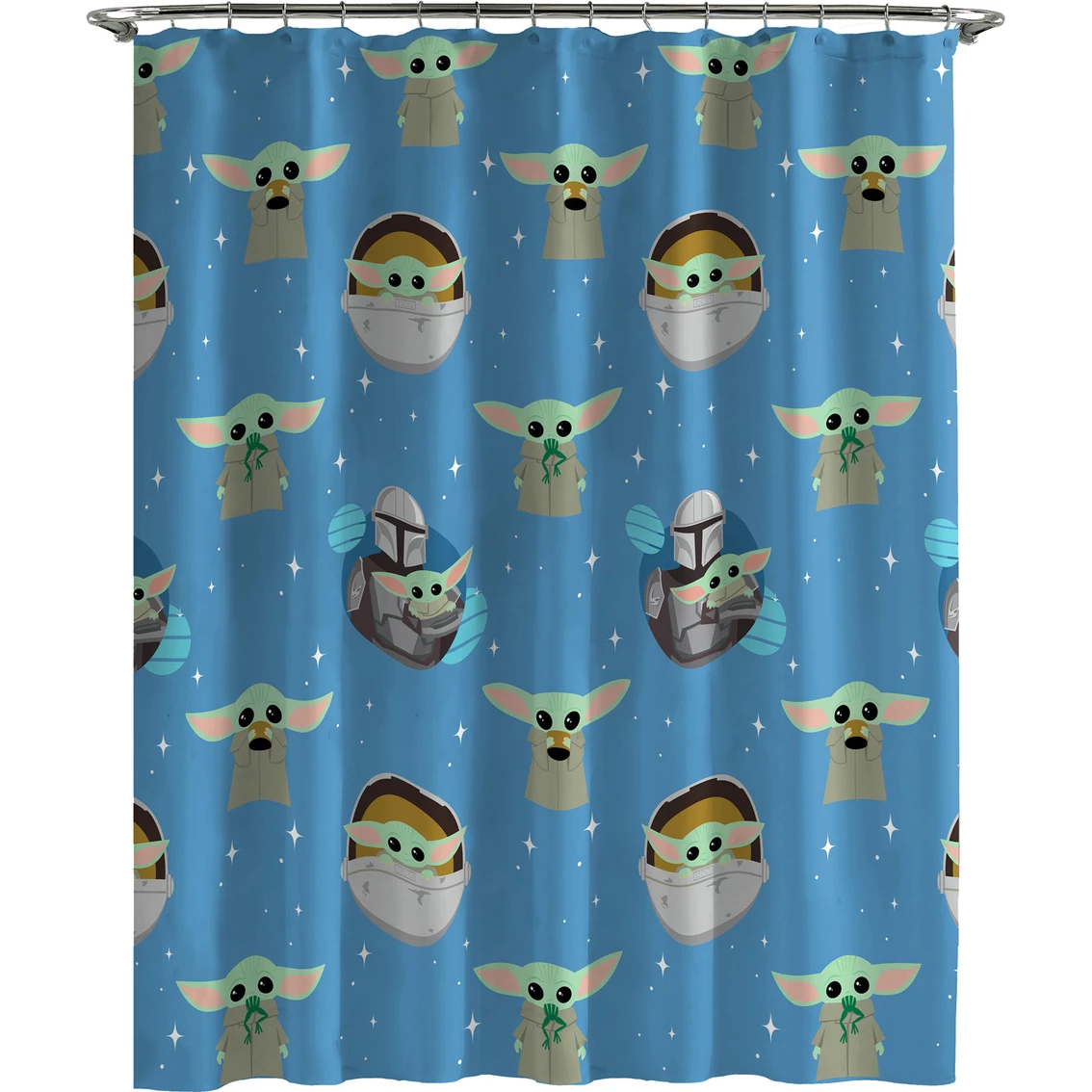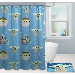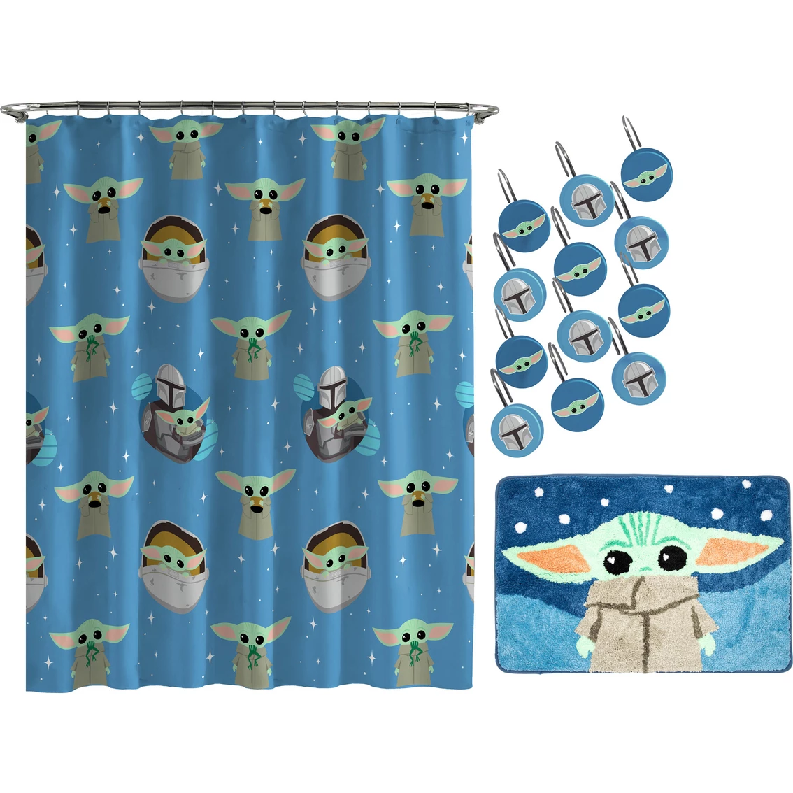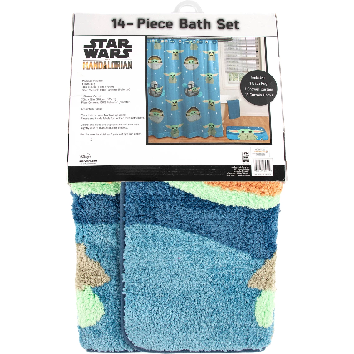 Give your little Star Wars fan the bathroom of their dreams with the Disney Star Wars The Mandalorian Bath 14 pc. set. The Mandalorian shower curtain from Disney measures 70 x 72 in. and bath rug measures 20 x 30 in. Shower curtain fits a standard shower curtain rod (liner not included). Shower curtain and hooks are easy to install and will instantly add a beautiful touch. The rugs soft fabric allows for absorbency while also being comfortable to touch. Style: JF08430AACD.