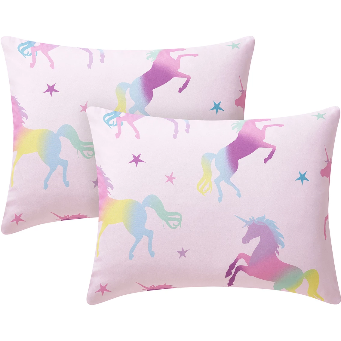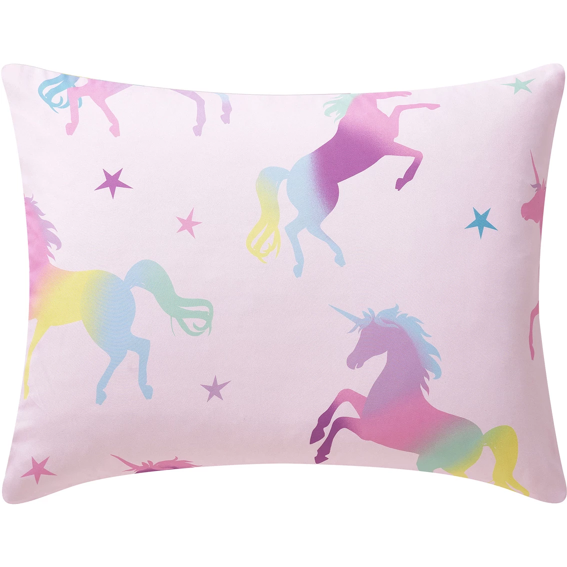 This easy care Jessica Sanders Unicorn Joy 5 pc. Comforter Set features allover unicorns on the Comforter and matching Pillow Shams. The set includes a coordinating Flat Sheet. A cute Decorative Pillow completes the look. Model: UNJCST.