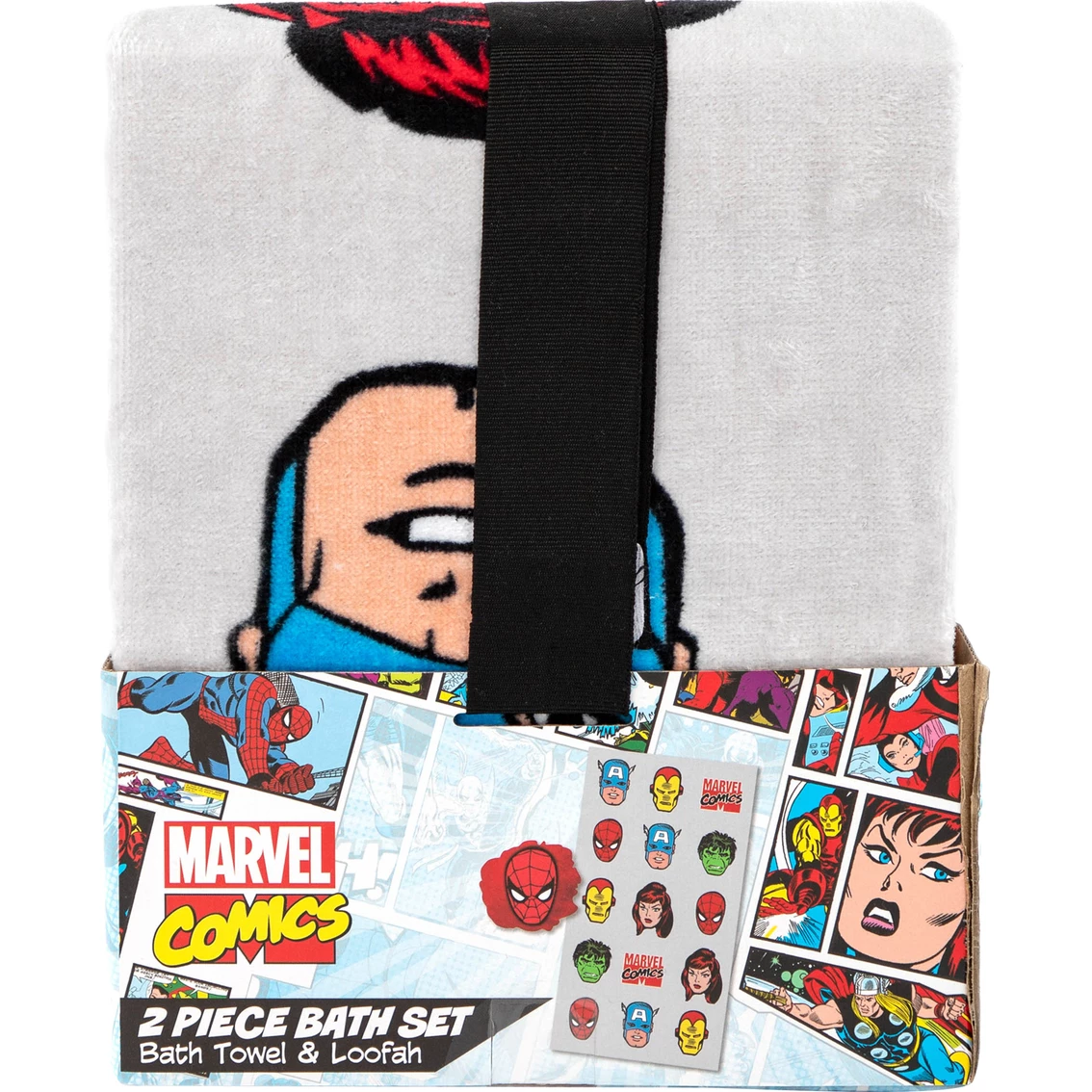 Bring home your favorite superheroes with this Marvel Bath Towel and 3D Loofa 2 pc. Set. Great for the bath, pool, or beach, your child will love drying off in this beautifully designed towel featuring their favorite Avengers: Captain America, Iron Man, and Hulk. Loofah features Spider-Man in 3D. This towel is made from 100% cotton terry ensuring softness while also being the highest quality in drying technology. Breathable fabric allows for absorbency while also being comfortable to touch. Matching loofah exfoliates and cleanses the body for smoother skin. Model: JF33395CD.