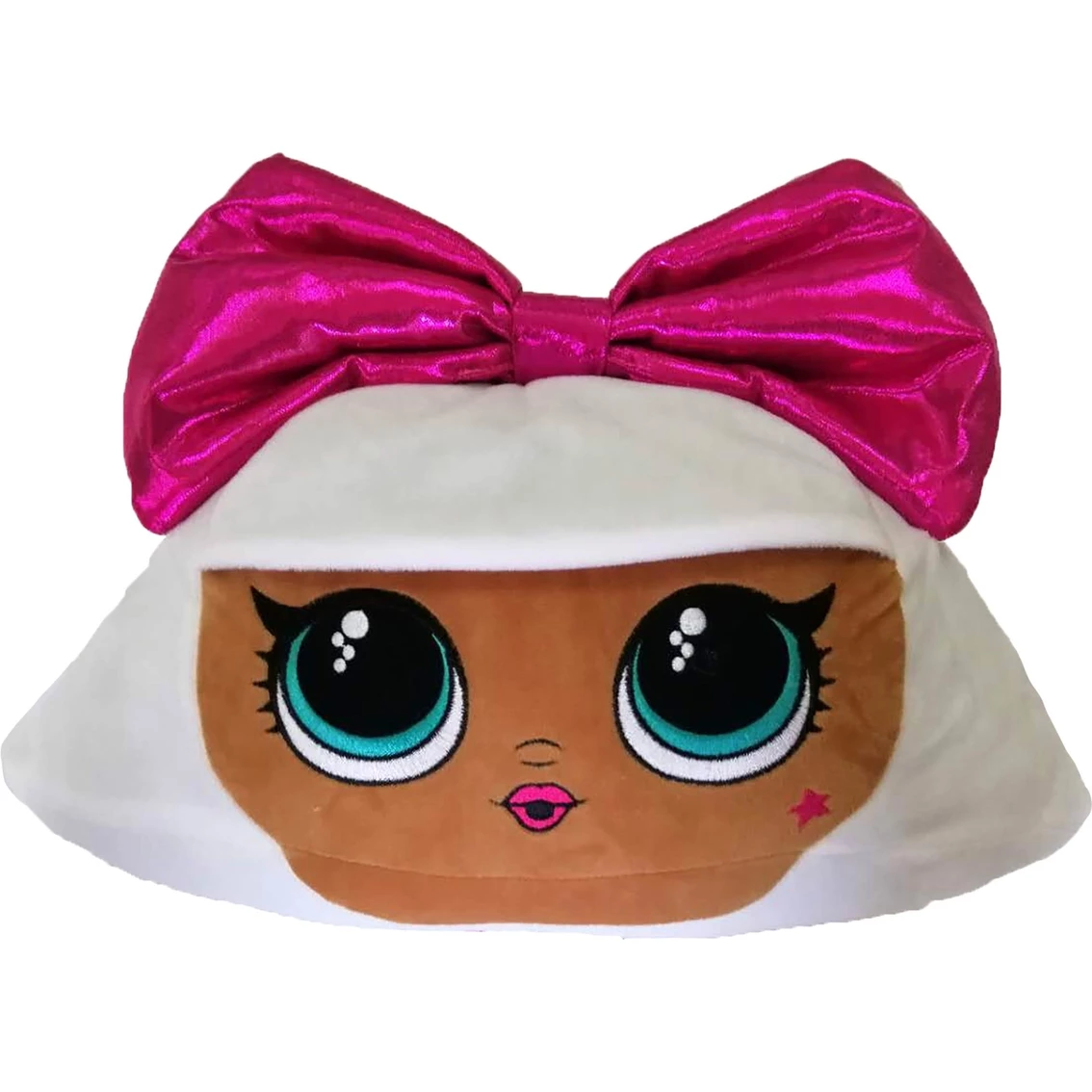 Cuddly LOL Surprise! Pink Bow Diva throw pillow. Diva face with shaped design. White pillow with a big pink bow. Made of 100% polyester. Spot clean only. 12 in. x 17 in. x 7.5 in. Style: PC997T.
