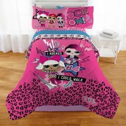 The MGA Entertainment LOL Rock Comforter features two of your favorite characters on a pink ground, then reverses to a purple gound with all over stars. Fits both a twin and full size bed. Made of 100% polyester microfiber. Machine wash cold before use; use non-chlorine bleach if needed. Tumble dry low, remove promptly. Do not iron. Model: ML982P.