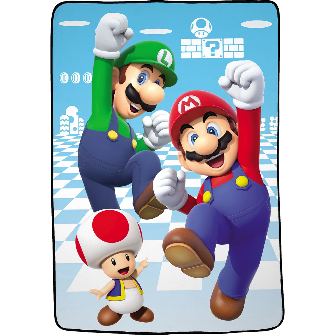 This fun new Nintendo Super Mario Game Kings Microrascel Blanket is 62 x 90 in. It features Mario, Luigi and Toad. Made of soft, cuddly 100% polyester. This blanket fits a standard twin size bed. Easy care. Model: AB139P.