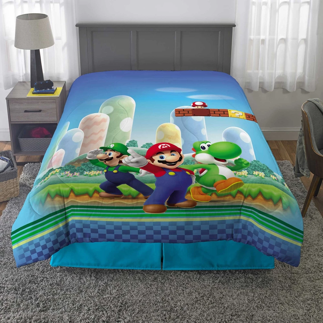 Your Super Mario fan is going to love this new Super Mario The More The Mario Twin/Full Comforter. Fun, reversible comforter features bold images of Mario, Luigi and Yoshi reversing to a blue checked ground with an all over print. Made of soft 100% polyester microfiber. This comforter fits both a standard twin and full size bed. Easy care. Measures 72 x 86 inches. Style: NL483P.