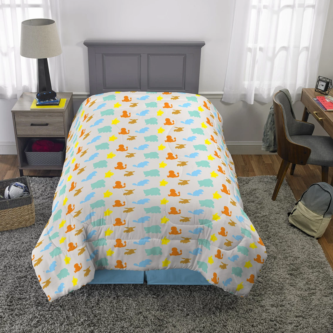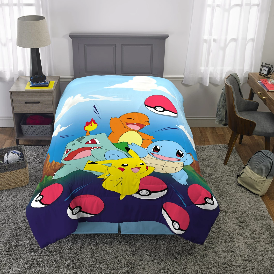 Your kids will love the newest Pokemon Fun Twin/Full Comforter. This comforter is 72 x 86 in. and will fit both a standard twin and full bed. The comforter features Pikachu, Bulbasaur, Charmander and Squirtle reversing to a gray ground with an all over print. Made of 100% polyester. Machine wash cold before use: use non-chlorine bleach if needed. Tumble dry low, remove promptly. Do not iron. Style: NL546P.