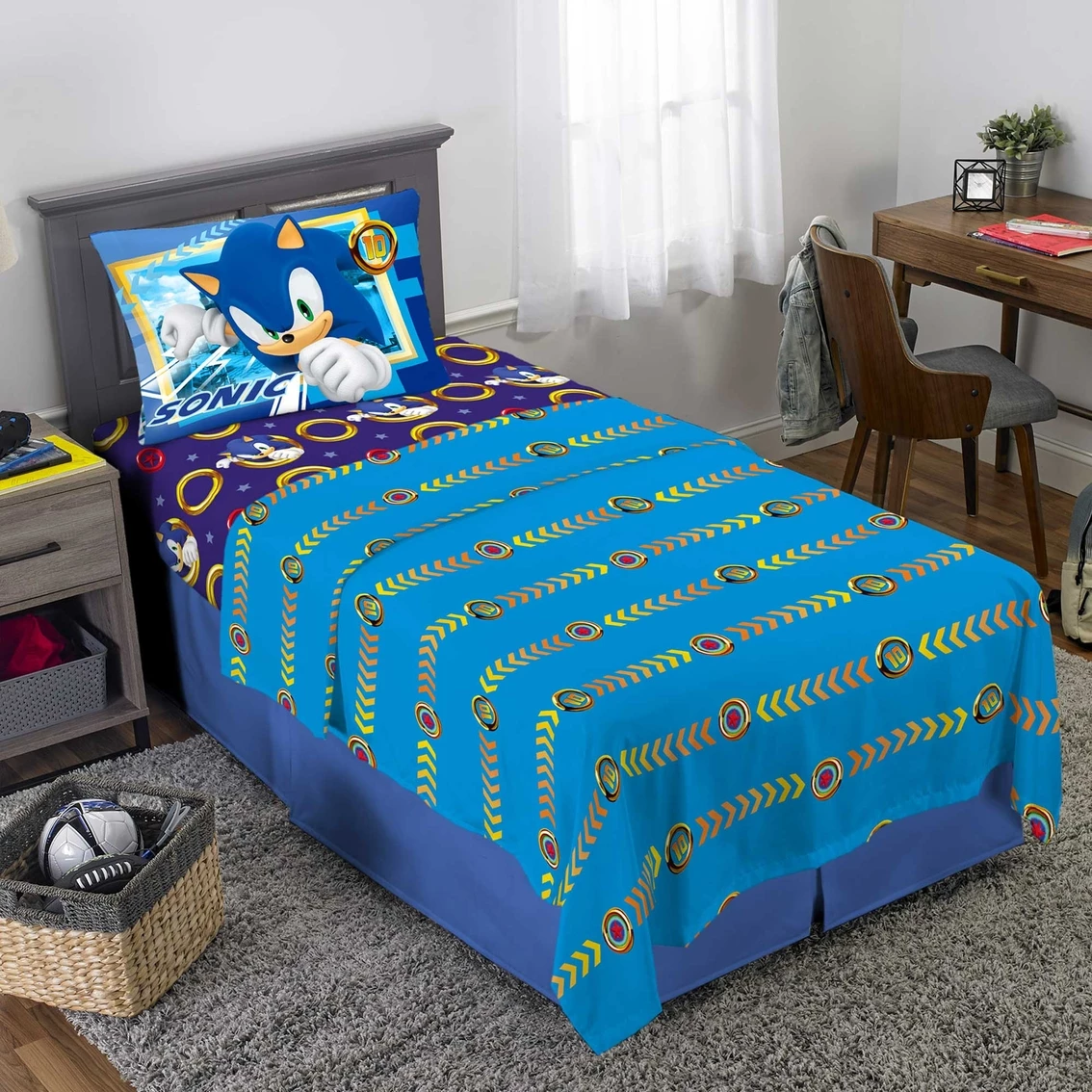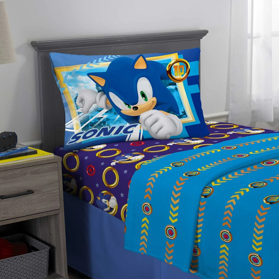 Your little Sonic the Hedgehog fan will love the newest Sega Sonic the Hedgehog Sonic On The Move Twin Sheet Set. Fun three-piece set includes a blue ground 66 x 96 inch flat sheet, a gray ground 39 x 75 x 10 inch fitted sheet, both with an all over print, and one 20 x 30 inch reversible pillowcase. Made of soft 100% polyester microfiber. Easy care machine wash. Style: NA454P.
