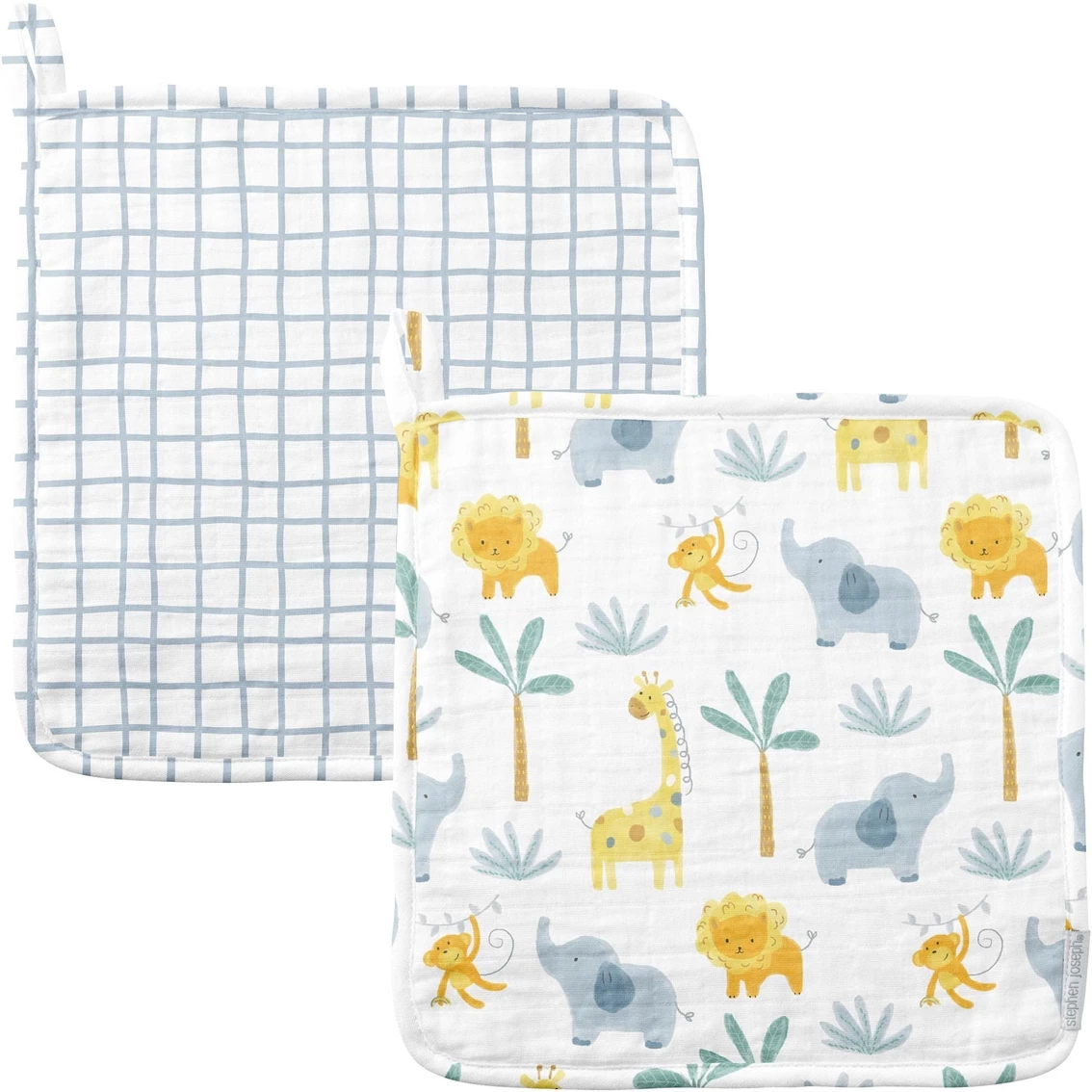Beloved Stephen Joseph muslin fabric is now available in washcloth form with this Zoo Washcloth two pack. Made of 100% cotton muslin and wash-drying terry cloth, these washcloths are both functional and beautiful, pairing back with corresponding muslin burp cloth sets and muslin blankets. Each washcloth features a hanging loop for each drying. Style: SJ124134.